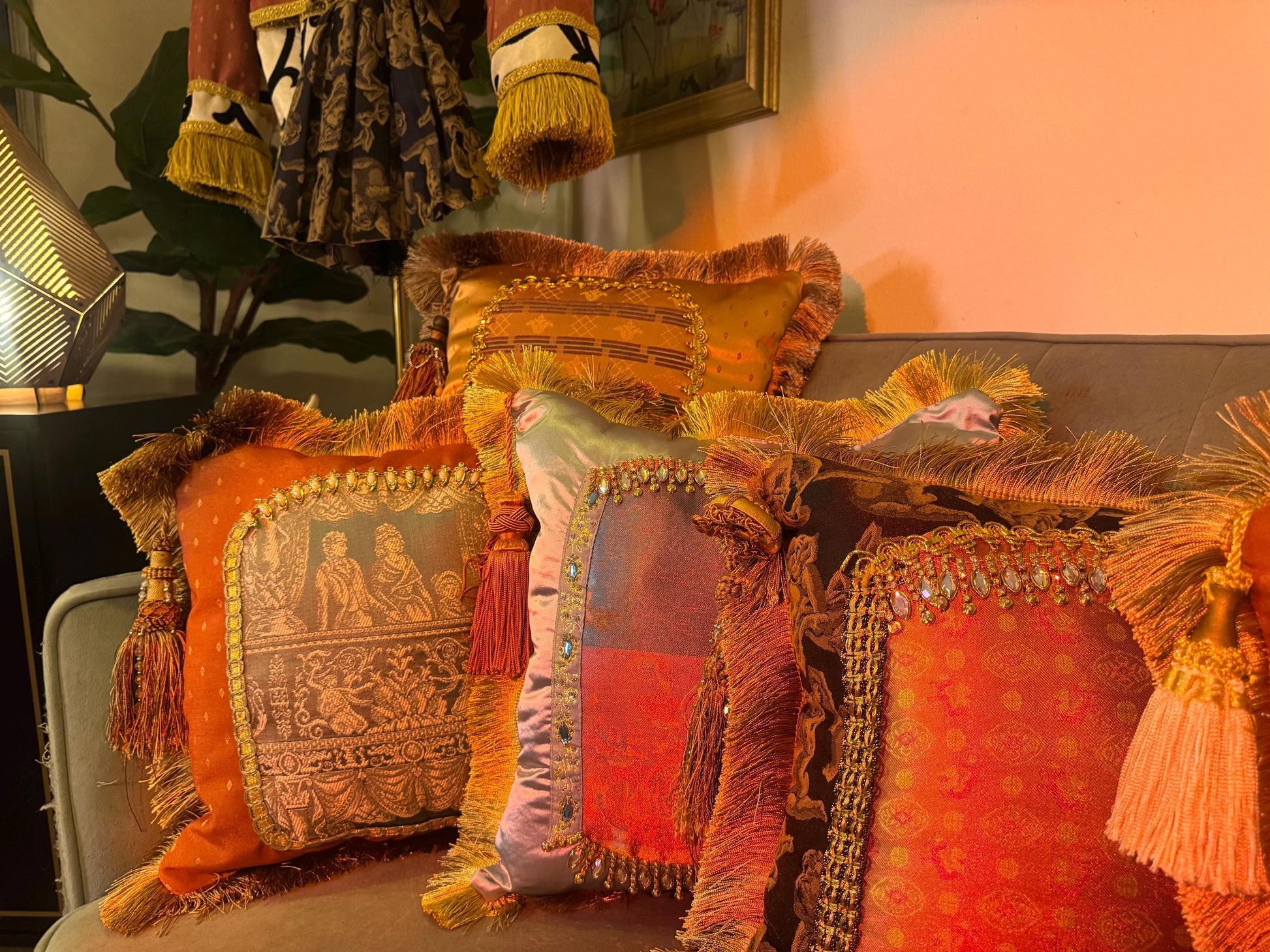 This one-of-a-kind pillow features a central dragon motif created with reverse appliqué, where a dragon-printed fabric is precisely inset behind a satin front panel, forming a seamless portal shape. The edges are finished with ornate jewel-fringe trim for texture and symbolic protection, while the back is crafted from soft powder-blue suede for contrast and grounding.