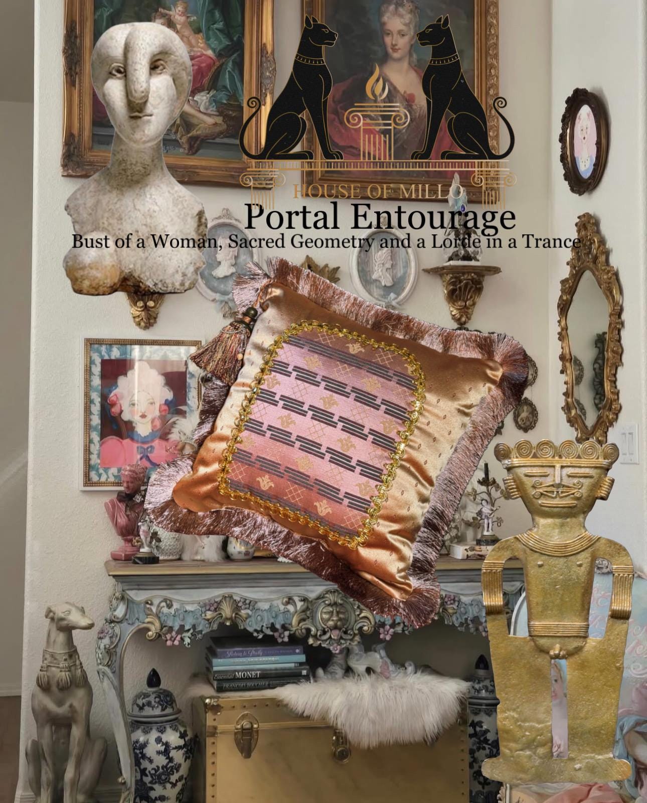 Portal Pillow 4 invites you into sacred symmetry — where grids bloom and gold threads map a gentle kind of geometry. Its soft pinks, fiery oranges, and structured embroidery reference the balance of design and remembering. It’s not chaos — it’s a divine equation.