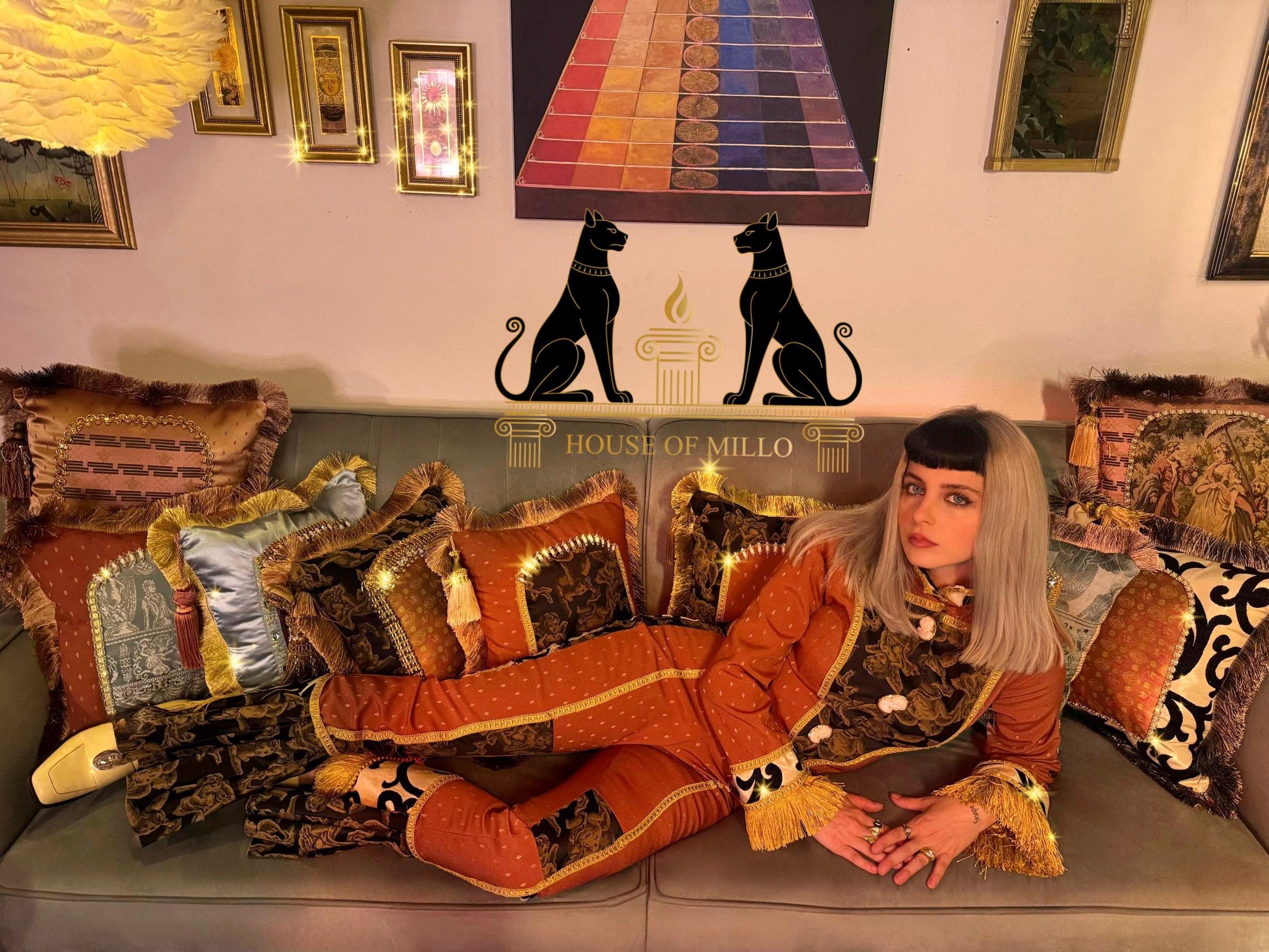 Portal Pillow 8 – Sentimental Triangle is an original statement cushion from House of Millo’s Portal Entourage collection. At its heart lies a pearl triangle, hand-appliquéd over a burnt red fabric woven with subtle gold diamond patterns. Each pearl is sewn individually, forming a symbolic structure surrounded by golden geometrical trim.
