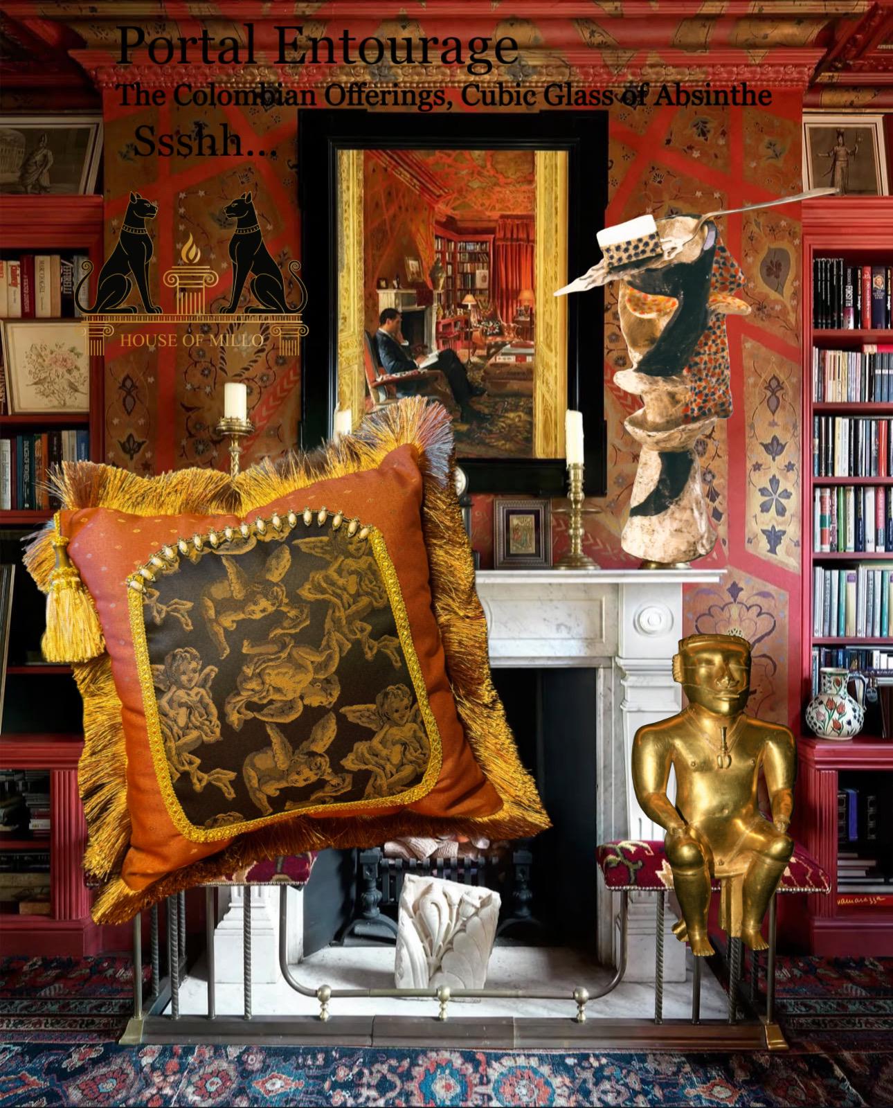 This 18”x18” handmade designer cushion features an inner tapestry of mythic cherubs surrounded by a deep black brocade. The outer frame is a rich brick red with embroidered gold diamond details, bordered by geometric golden trim. Accented with rose gold fringe and white stone embellishments, the pillow exudes eccentric elegance and storybook glamour.