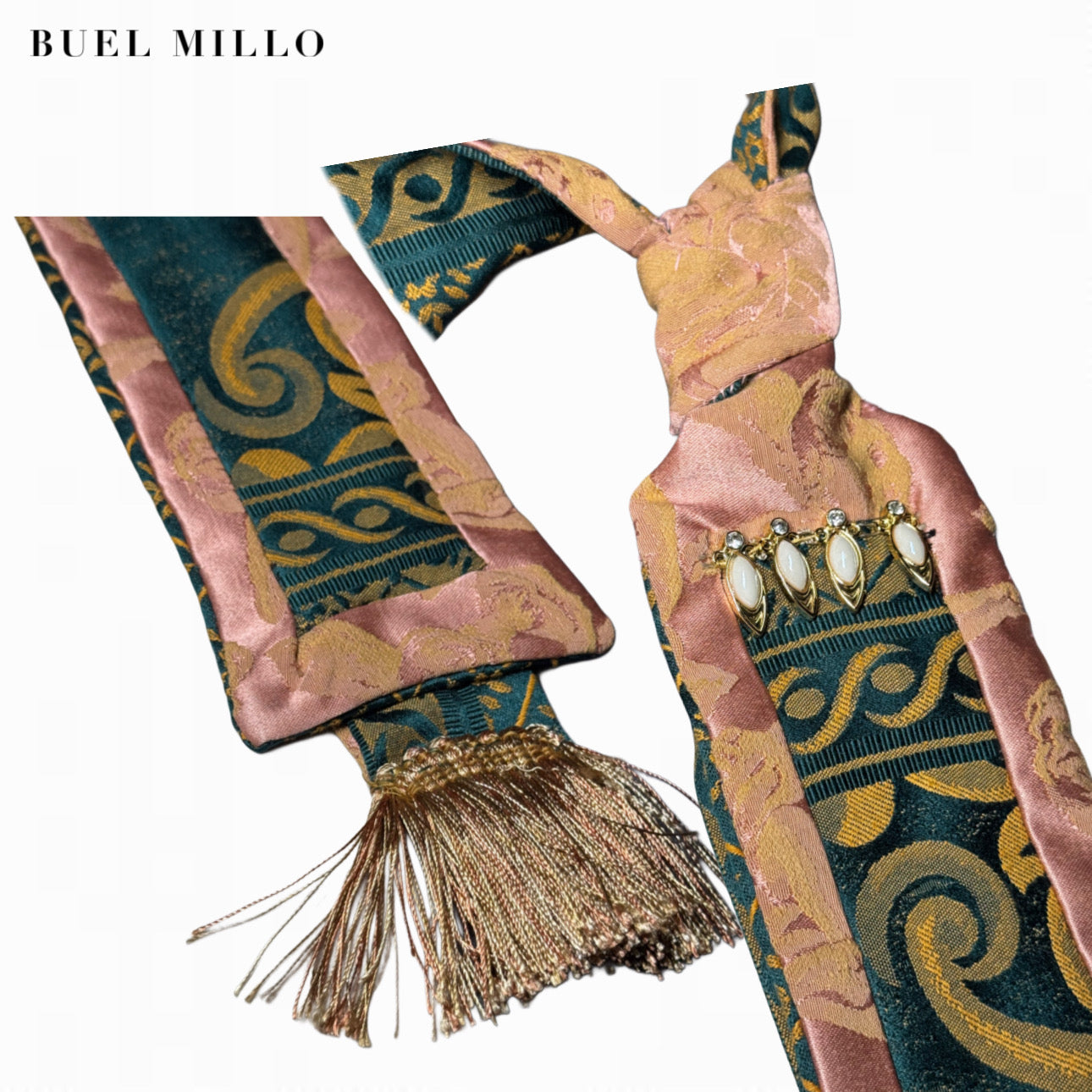 This handmade Buel Millo tie is created from a collage of vintage jacquards, shimmering trims, structured cotton and soft polyester blends.